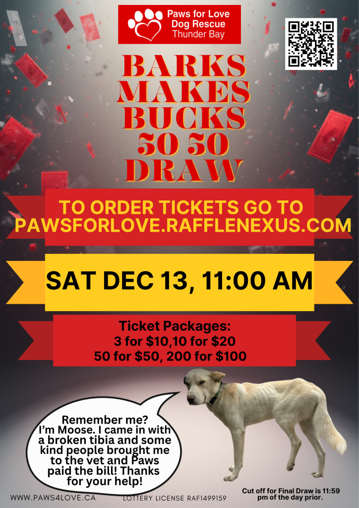 HELP US PAY OUR VET BILLS! Get your tickets online at https://pawsforlove.rafflenexus.com/ And watch our Facebook Page for in-person ticket sale locations where you can purchase tickets using cash, debit, credit card or etransfer. Thanks for your support!