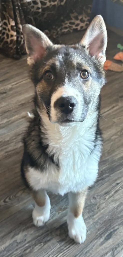 Maximus (Max) is husky/sheph/collie and any other mix, about 3 to 4 months old, and currently weighing about 22 pounds. He’s very lovable, smart (learns quickly), and energetic. He plays well with his foster sibling which area larger dogs . Maximus quietly observes his foster siblings and therefore would benefit from a home with an older pet sibling to show him the ropes. He has excellent recall, has already learned “outside” & “come”, does well with a crate and sleeps in it through the night. He enjoys attention, pets, being picked up and held, but not as interested in snuggling on the sofa. Because Maximus was found as a stray, he is food motivated which helps with his training. He is working on potty training outside and will need consistency and routine to thrive. Whoever adopts this cute fur ball will have won the lottery of pups and won’t be disappointed! He’s ready to go to his furever home now that he’s had his 2 vaccines and been microchipped and dewormed. If you would like to meet this handsome dude, please fill out an adoption application below.
